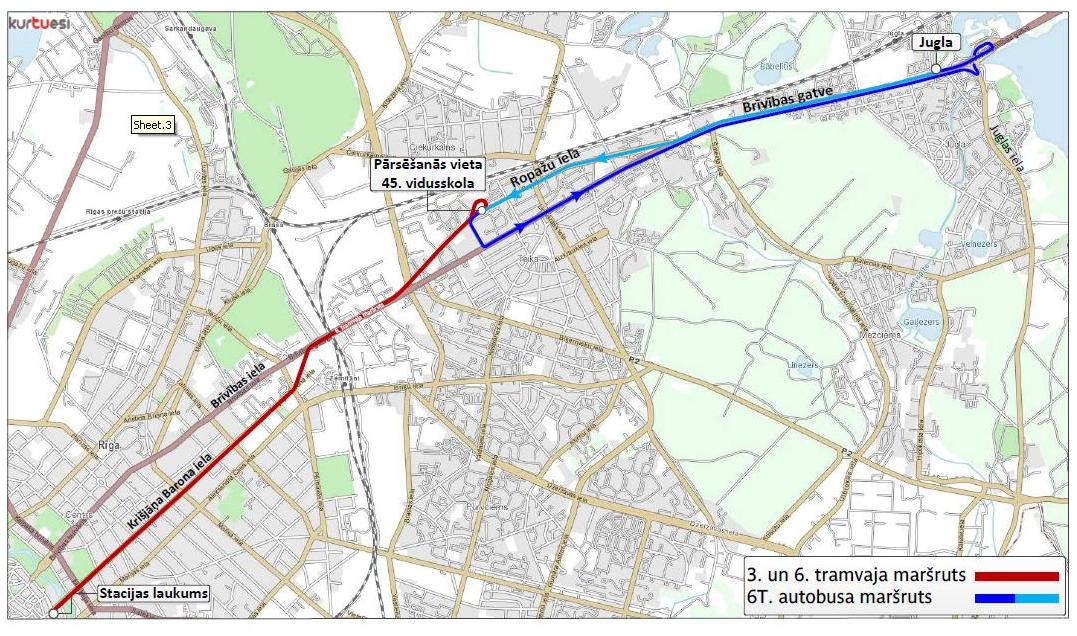 Starting from April 14 and throughout the reconstruction period, trams No. 3 and 6 run from the city centre to tram stop "Secondary school No. 45", where passengers are offered to transfer to bus No. 6T, which runs to the crossing of Brīvības gatve and Juglas Street.