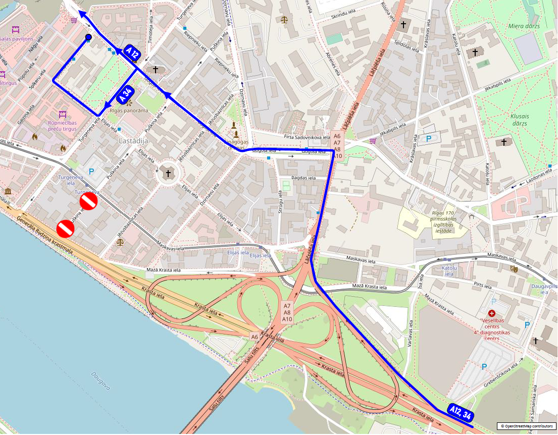 34. autobuss virzienā uz Centrāltirgu kursē pa maršrutu līdz Krasta ielai, tālāk pa Krasta ielu, uzbrauktuvi uz Salu tiltu Lāčplēša ielas virzienā, Lāčplēša ielu, Gogoļa ielu, Turgeņeva ielu, Prāgas ielu un tālāk pa maršrutu.
