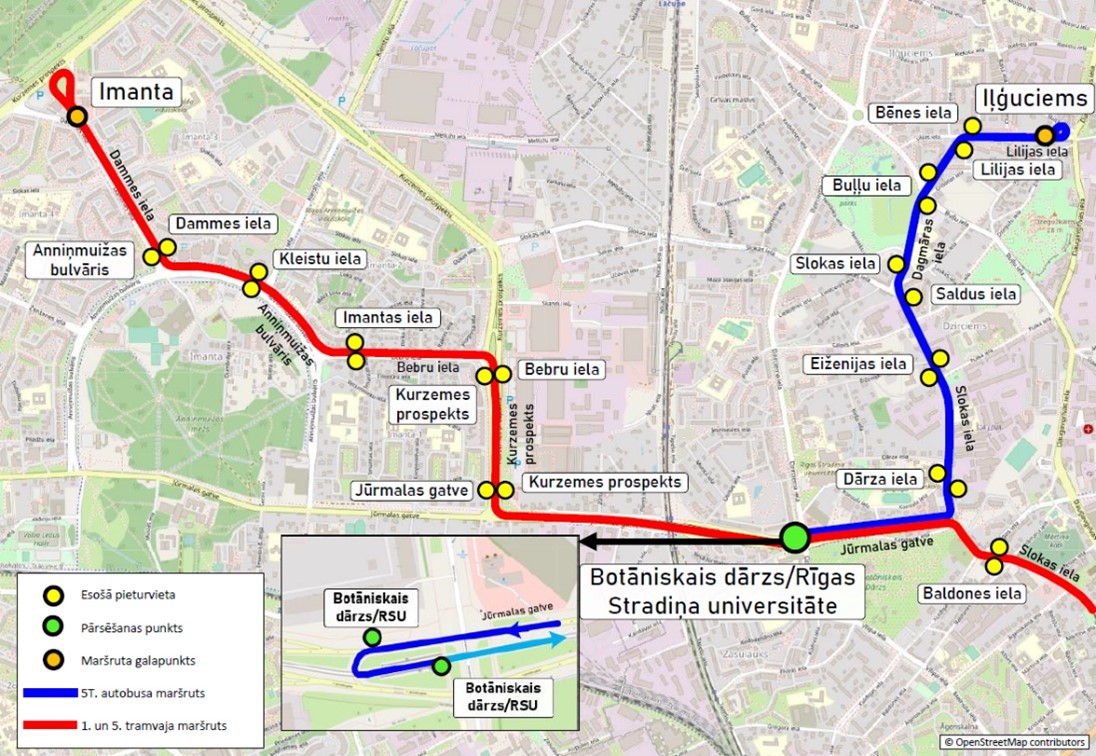 No 14. aprīļa uz būvdarbu laiku 5. maršruta tramvaji kursēs maršrutā “Imanta - Mīlgrāvis”, bet posmā no galapunkta “Iļģuciems” līdz Jūrmalas gatvei tiks organizēts 5T autobusa maršruts “Iļģuciems - Botāniskais dārzs”, un tramvaja kustība šajā posmā tiks slēgta. Pasažieriem tiks nodrošinātas iespējas pārsēsties starp maršrutiem pieturvietā “Botāniskais dārzs/Rīgas Stradiņa universitāte” (Jūrmalas gatve). Pārsēšanas laiks starp maršrutiem būs 2-3 min, atsevišķos reisos 4 minūtes.