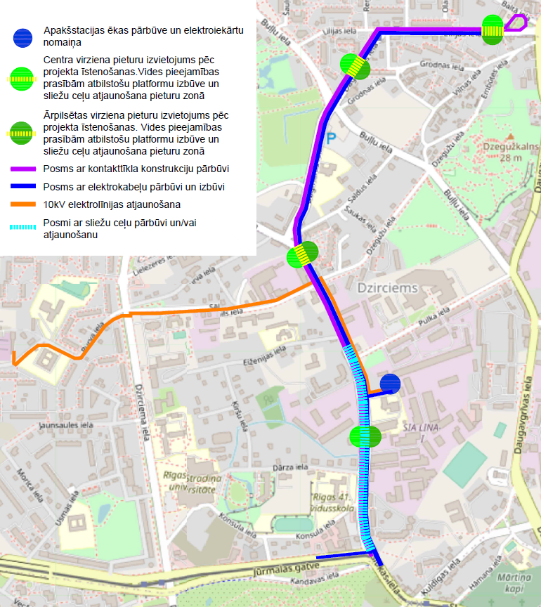 - 5. tramvaja maršruta posma no Slokas ielas un Jūrmalas gatves krustojuma līdz galapunktam “Iļģuciems” infrastruktūras pielāgošana – kopumā aptuveni 2 kilometru garumā;